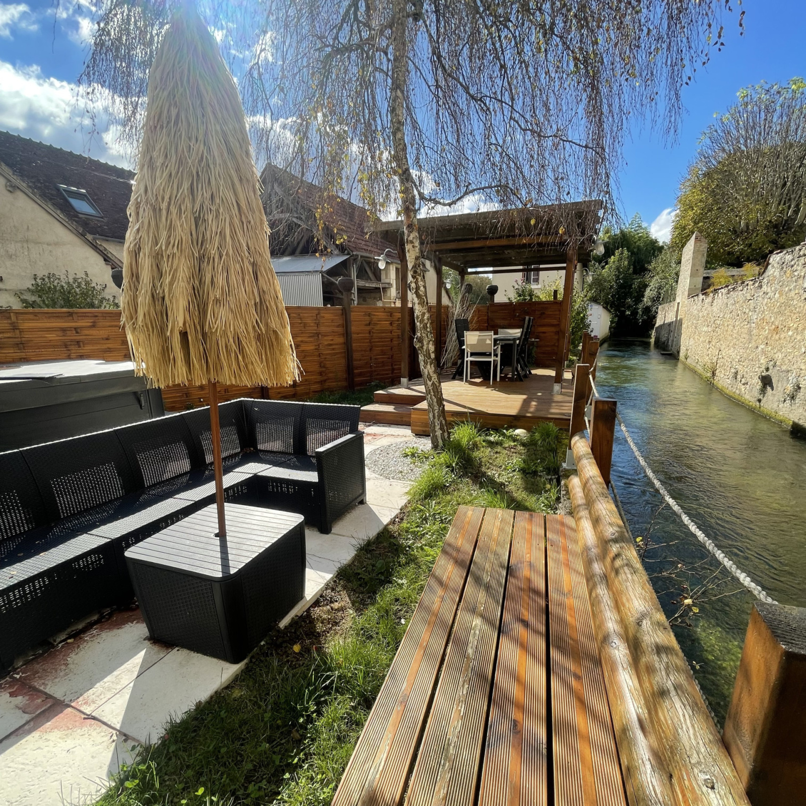 SAINT-BOUIZE, au fil de l'eau, Charmante demeure Cosy, d'ameublement et d'aménagement. Une entrée dessert une cuisine équipée, un salon-séjour salle à manger. Au 1er étage, un palier dessert une chambre avec salle d'eau et toilette. Au deuxième étage, une grande chambre. A l'extérieur, une terrasse avec son jacuzzi au bord de la rivière et un potager non attenant. Double vitrage, tout à l'égout et chauffage électrique.