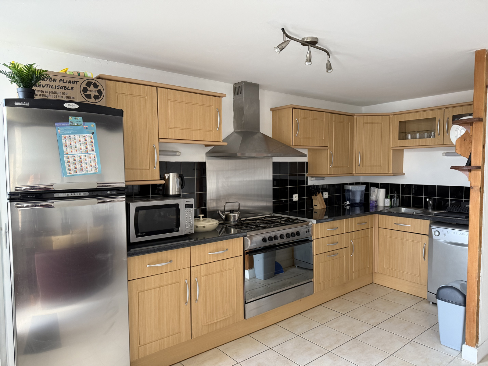 Au rez-de-chaussée, une pièce de vie lumineuse avec poêle à bois offre un espace convivial et chaleureux. Vous y trouverez également une cuisine aménagée et équipée et des toilettes indépendants.